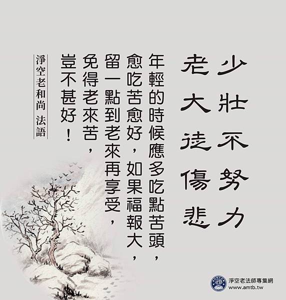 年輕的時候應多吃點苦頭,愈吃苦愈好,如果福報大,留一點到老來再享受,免得老來苦,豈不甚好!如係在校青年學生,更不可只圖 享受,貪玩,混文憑,而荒廢學業,如無真正技能與真實學問,入了社會必定發生種種障礙。所謂少壯不努力,老大徒傷悲,現在老來有結局的人,都是年輕時吃過苦頭的。